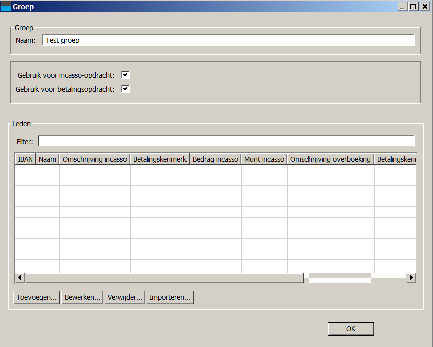 Geef de nieuwe groep een naam. Deze naam moet uniek zijn. Verder kunt u kiezen of deze groep beschikbaar moet zijn voor incasso’s en/of betalingen. Door bijvoorbeeld het vinkje bij betalingsopdracht weg te halen weet u zeker dat u deze groep nooit per ongeluk kunt kiezen voor een betalingsopdracht.