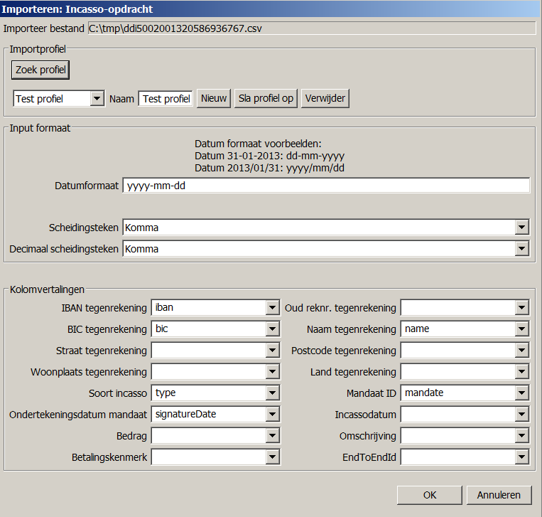 Om een Excel of CSV bestand te importeren klikt u op de knop “Importeren” in het gedeelte ‘Incasso’. Kies nu het Excel- of CSV bestand dat u wilt importeren. Er verschijnt nu een venster waarin u het importprofiel kunt instellen. Als er al importprofielen eerder aangemaakt zijn, dan probeert IBANC het best passend profiel automatisch te vinden. U kunt een voorbeeld van dit scherm vinden in Figuur 11.
